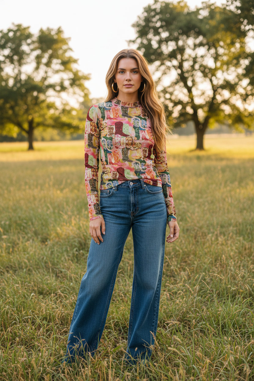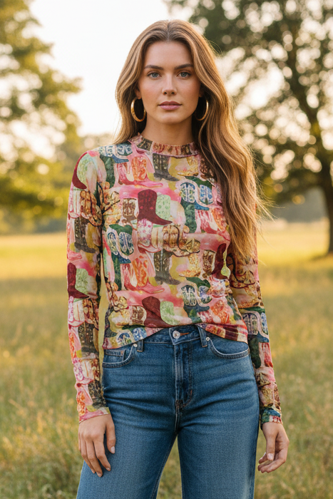 Explore the world with this Funky Boot Mesh Top. This blouse is a perfect blend of style and comfort, reflecting our commitment to high-quality clothing. Its unique design is a testament to our artisans' expert craftsmanship. With its Western-inspired style, it easily blends into any wardrobe, offering a versatile piece that can transition from day to night with ease. A true embodiment of our brand ethos, this top is designed for real women who make things happen.